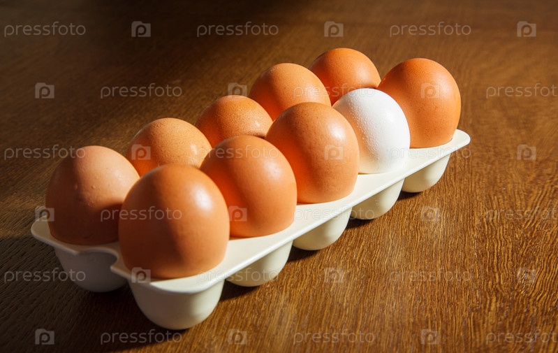 Девять коричневых яиц и одно белое яйцо в пластиковом лотке