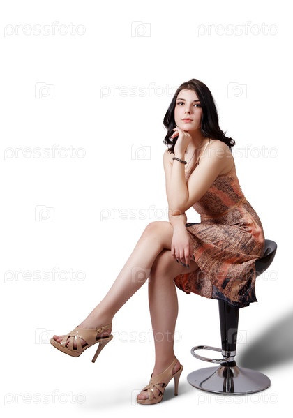 Красивая девушка в бежевом платье позирует в студии, сидя на стуле