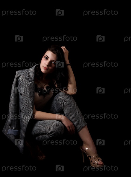 Молодая красивая девушка в деловом костюме позирует сидя на полу в студии на черном фоне