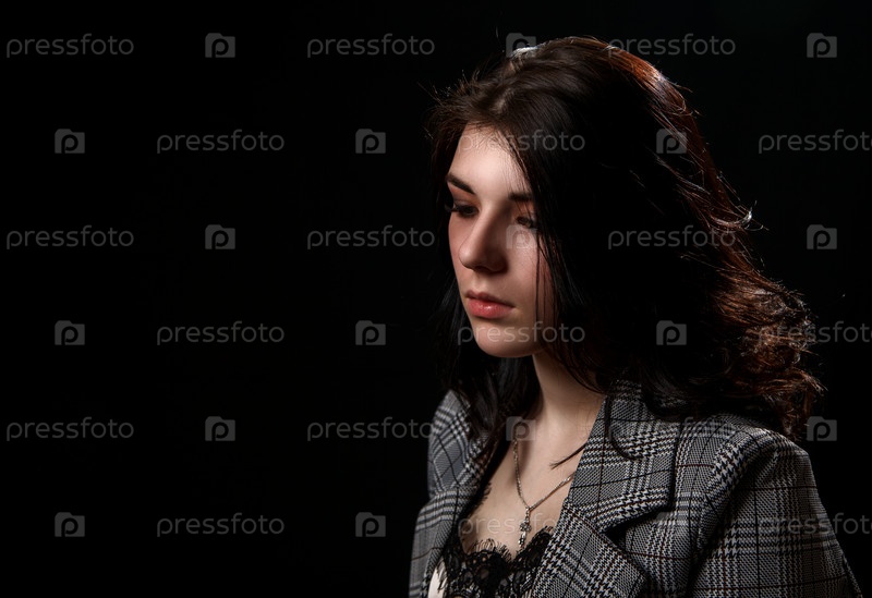 Портрет молодой красивой брюнетки в деловом костюме в студии на черном фоне