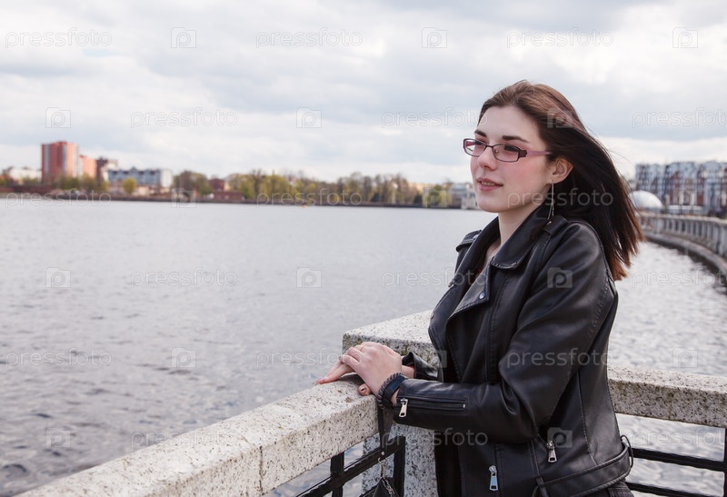 Молодая красивая брюнетка в черной куртке и джинсах стоит на набережной возле озера в городском парке в солнечный весенний день