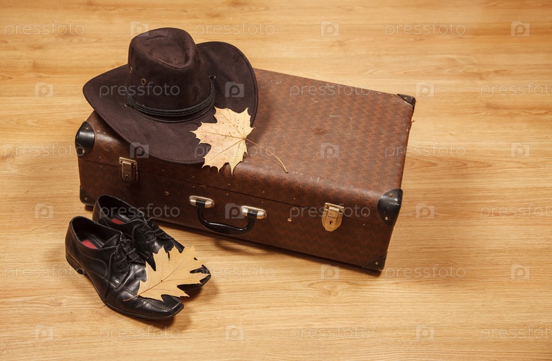 Комплект из мужской фетровой шляпы с желтым кленовым листом, черных туфель и чемодана