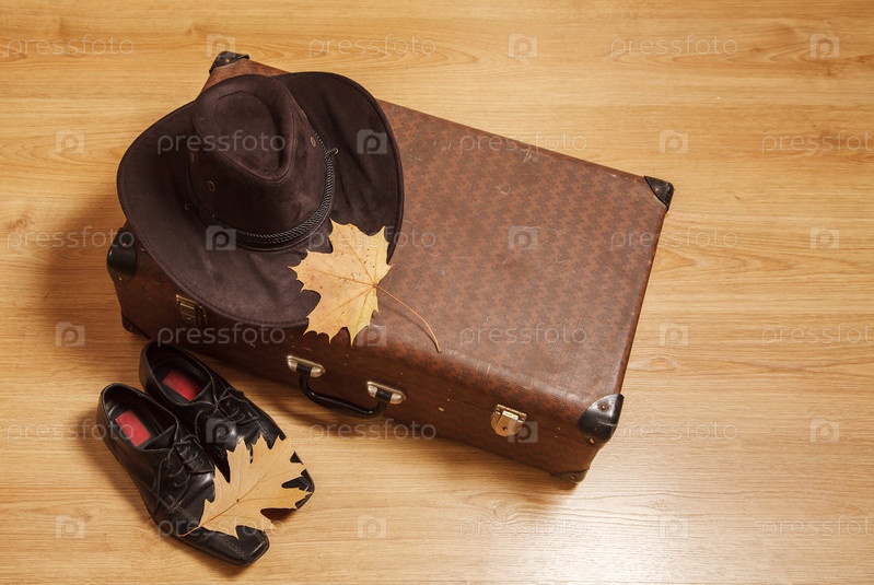 Комплект из мужской фетровой шляпы с желтым кленовым листом, черными туфлями и чемоданом