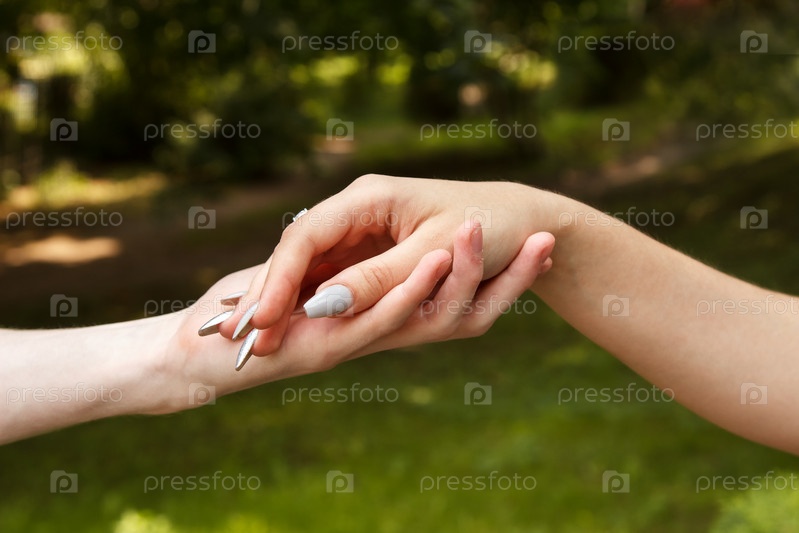 Мужчина и женщина, взявшись за руки. руки крупным планом. на открытом воздухе в летний день