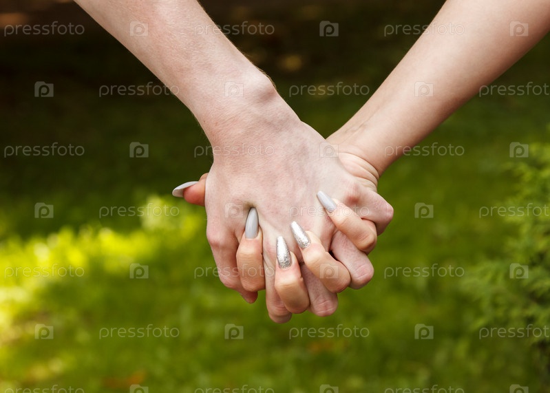 Мужчина и женщина, взявшись за руки. руки крупным планом. на открытом воздухе в летний день