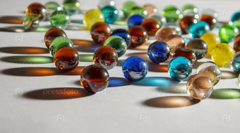 Разноцветные стеклянные шарики на столе в помещении крупным планом