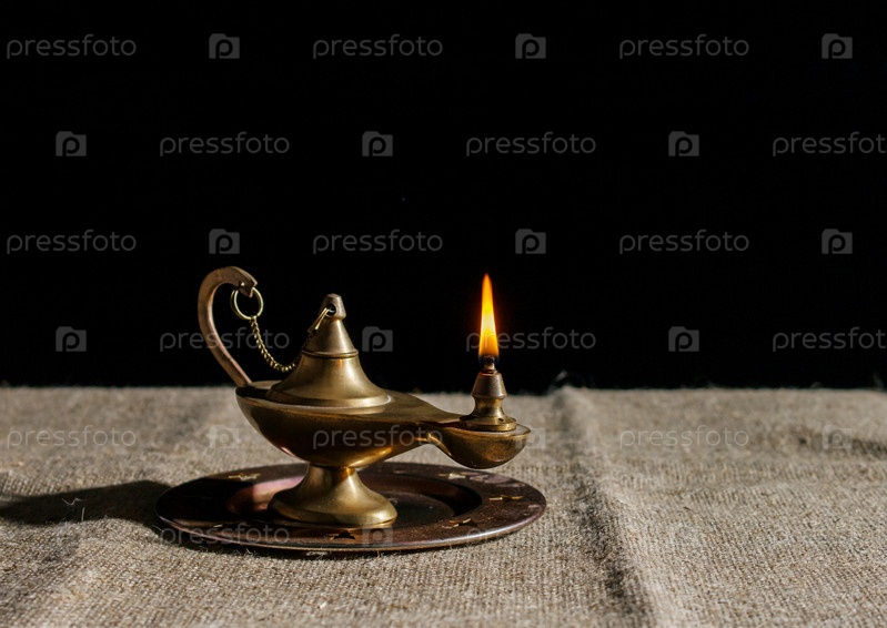 Горящая волшебная лампа аладдина на столе. закрытый крупным планом на черном фоне