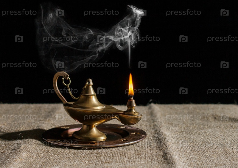 Горящая волшебная лампа аладдина на столе. закрытый крупным планом на черном фоне