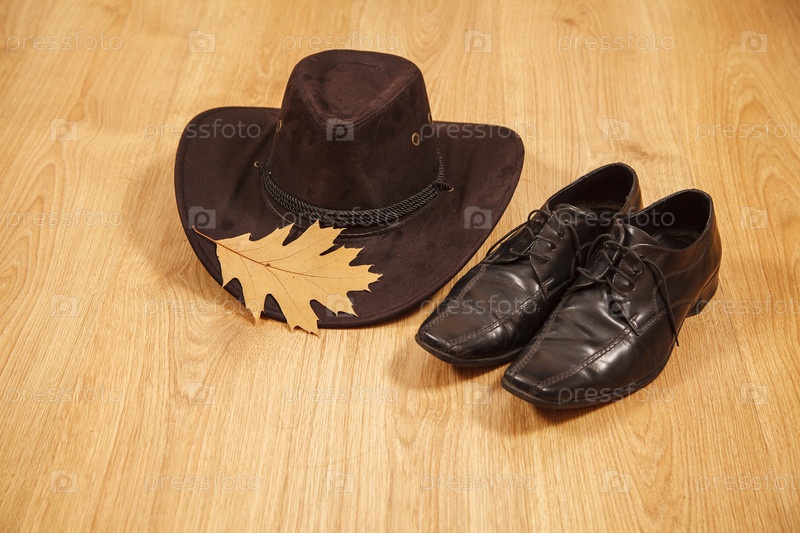Комплект из мужской фетровой шляпы с желтым кленовым листом и черными туфлями