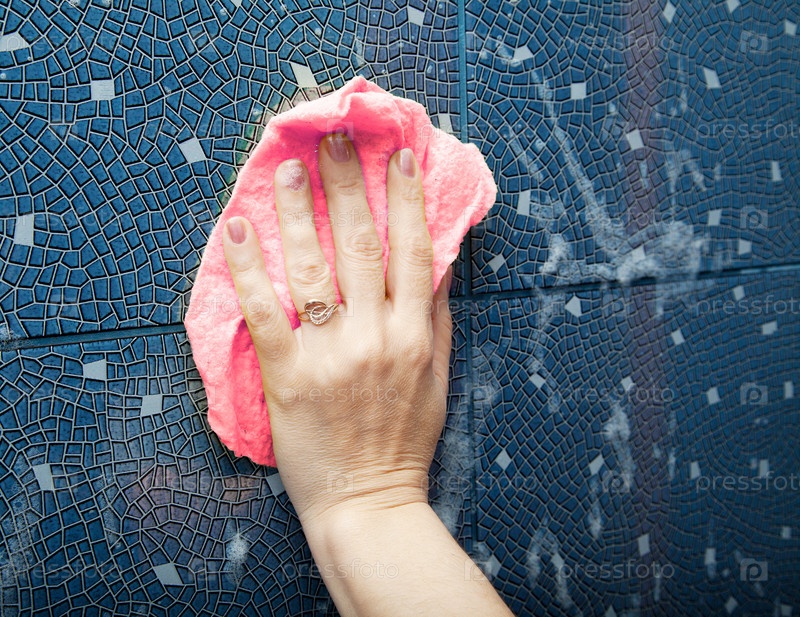 Женская рука с тряпкой моет стену