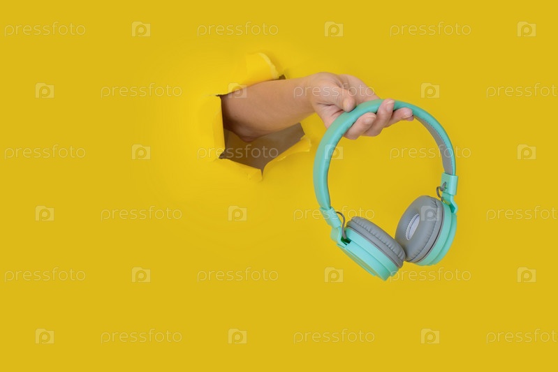 Рука держит синие наушники на рваной желтой бумаге. Музыкальная концепция