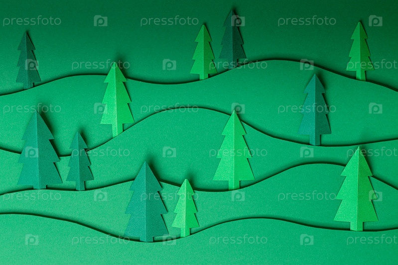 3D выскакивают бумажные елки на зеленом фоне. карта дизайна резка бумаги