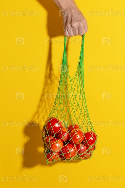 Мужская рука держит зеленую сетчатую сумку с овощами на желтом фоне