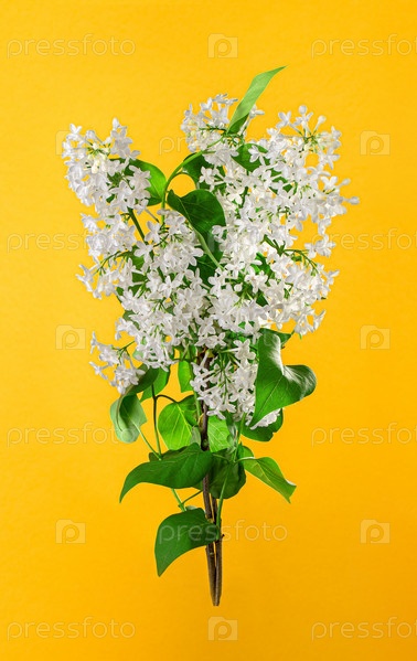 Весенняя белая ветка сирени на ярко-желтом фоне
