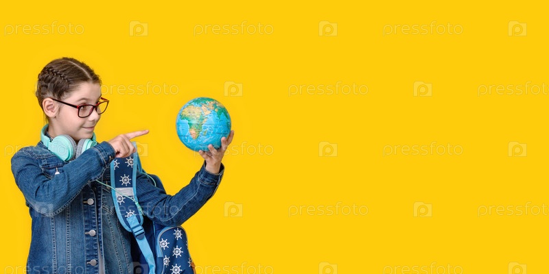 Молодая школьница 8-9 лет с рюкзаком держит в руке земной шар