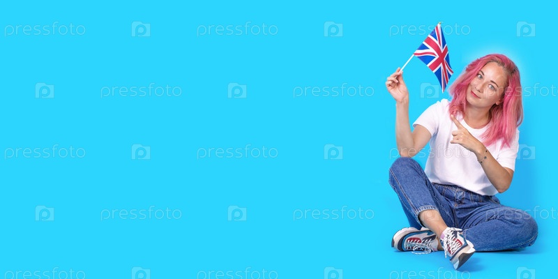 Молодая студентка указывает на флаг Великобритании, призывая ее выучить английский язык