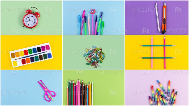 Набор школьных аксессуаров для обучения рисованию букв на фоне разноцветной бумаги