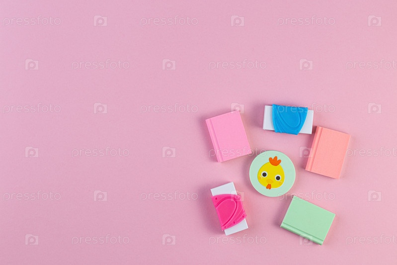 Красочные резиновые ластики на розовом фоне. Разноцветные школьные принадлежности