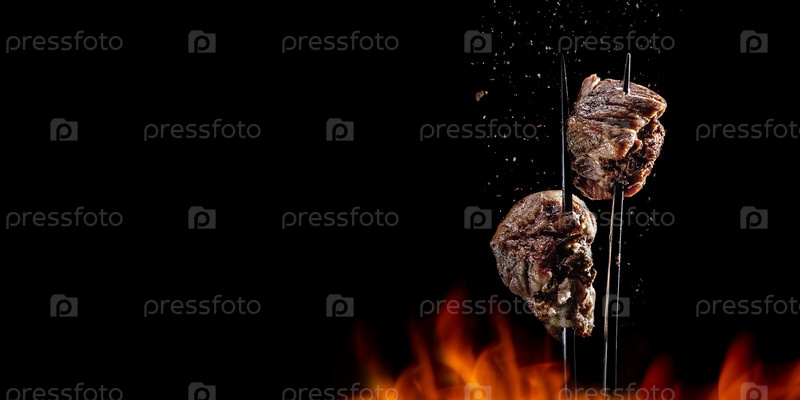 Вилка с кусочками вкусного мяса на гриле на черном фоне
