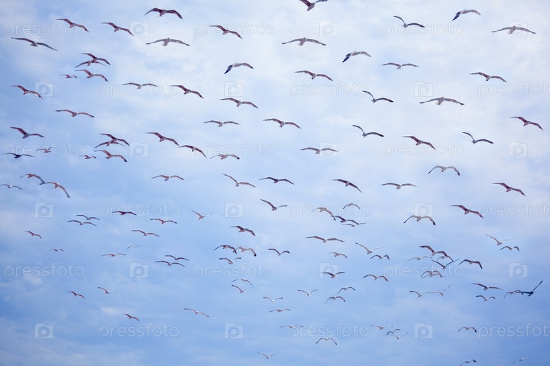 Летящие чайки на фоне голубого неба