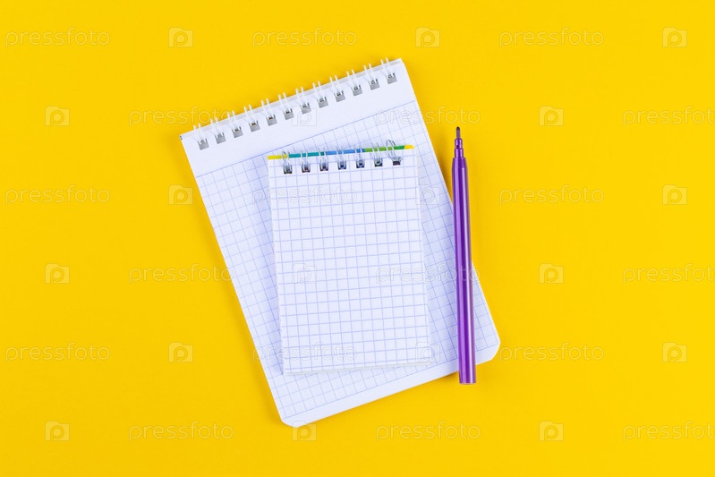 Открытый блокнот на ярко-желтом бумажном фоне с ручкой