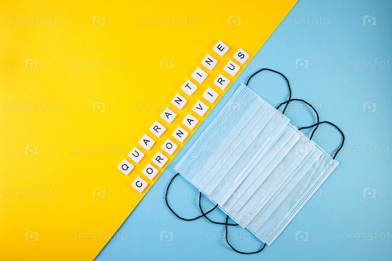 Надпись карантин и коронавирус на синем и желтом фоне. Медицинские защитные маски