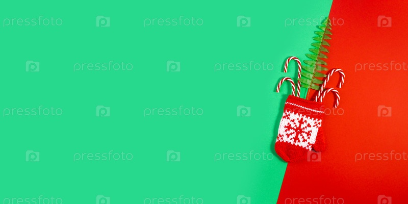 Рождественские красные вязаные варежки с мотивами снежинок. Новогодняя минимальная концепция с копией пространства