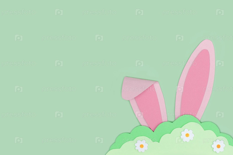 Счастливой Пасхи. Розовые кроличьи уши прячутся в траве из зеленой бумаги на зеленом фоне