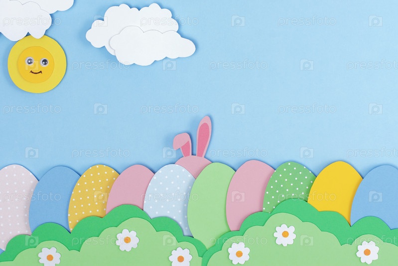 Розовые заячьи ушки и расписные пасхальные яйца из бумаги. Счастливого пасхального фона с кроликом, прячущимся в траве. Шаблон пасхальной открытки. Креативная пасхальная минимальная концепция с копировальным пространством Плоская планировка
