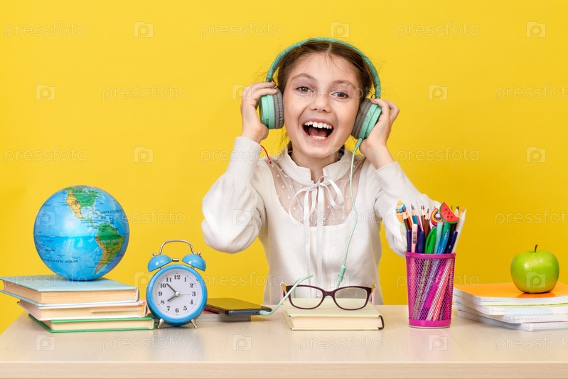 Школьница сидит за партой и слушает музыку в наушниках