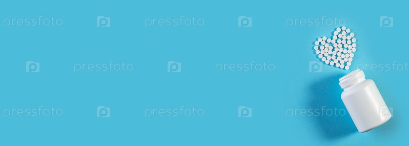 Белые таблетки в форме сердца с бутылкой на синем фоне. Макет для рекламы или других идей. Концепция медицины и здравоохранения. Медицинский широкий баннер с местом для текста