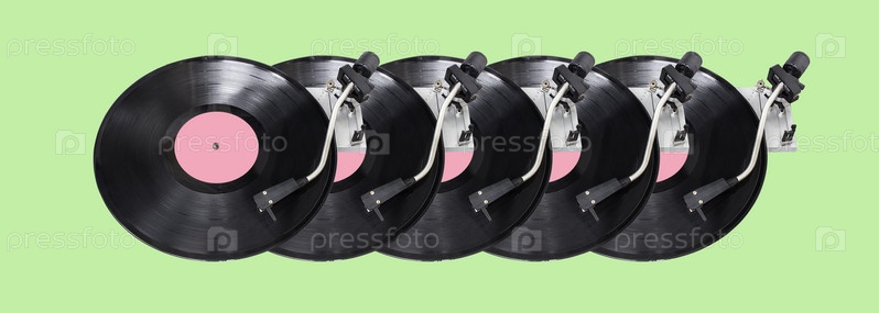 Абстрактная часть проигрывателя изолирована на зеленом фоне. Диск-жокей проигрыватель и винил. Концепция ретро-музыки. Длинный широкий баннер. Скопируйте пространство для вашего дизайна