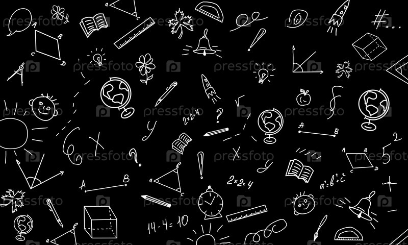 Бесшовный узор. Назад к школьным формулам. черная доска с творческим детским рисунком. Рисунок мелом от руки на доске. Концепция образования