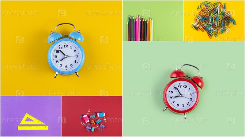 Коллаж фотографий различных канцелярских принадлежностей на фоне разноцветной бумаги. Вернуться к школьной концепции