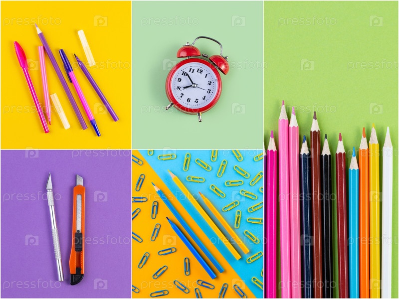Коллаж фотографий различных канцелярских принадлежностей на фоне разноцветной бумаги. Вернуться к школьной концепции