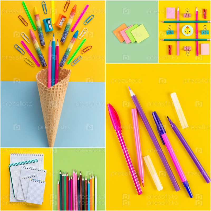 Коллаж фотографий различных канцелярских принадлежностей на фоне разноцветной бумаги. Вернуться к концепции школы и образования
