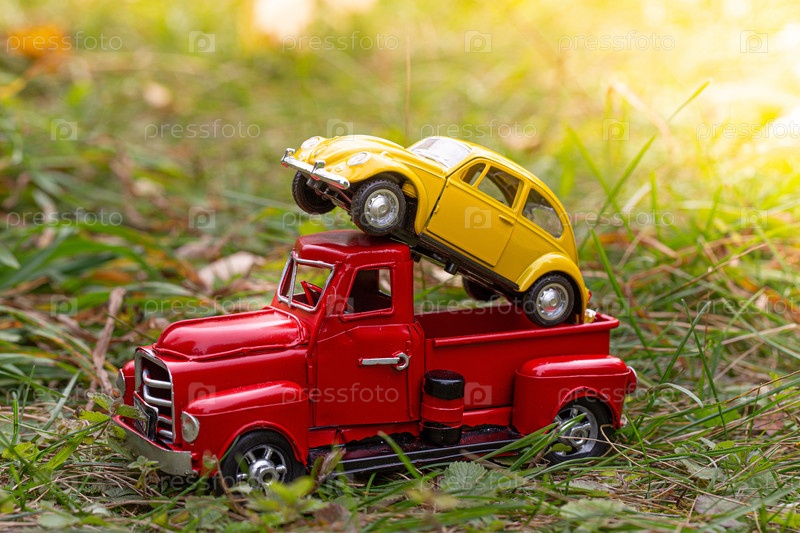 Ижевск, Россия, 14 сентября 2019 г. Игрушечный ретро-автомобиль в осеннем лесу