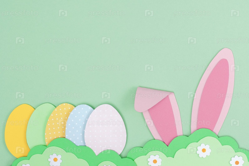 Розовые заячьи ушки и расписные пасхальные яйца из бумаги. Счастливого пасхального фона с кроликом, прячущимся в траве. Шаблон пасхальной открытки. Креативная пасхальная минимальная концепция с копировальным пространством Плоская планировка