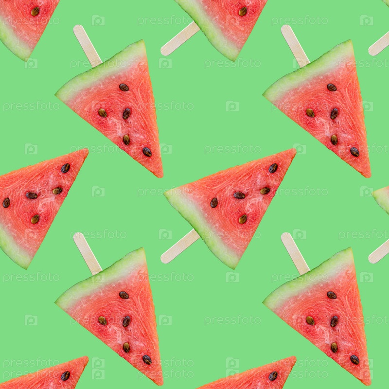 Красочные фрукты Красочные фрукты бесшовный фон из кусочков свежего арбуза на зеленом фоне. Вид сверху