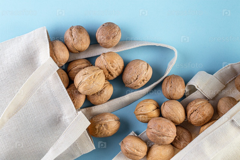Грецкие орехи в хлопковом мешке на синем фоне. Плоская планировка, вид сверху с копией пространства