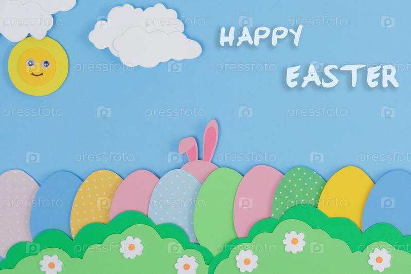 Счастливой Пасхи. Розовые заячьи ушки и пасхальные яйца из бумаги. фон с кроликом спрятаться в траве. Шаблон пасхальной открытки. Креативная пасхальная минимальная концепция с копировальным пространством Плоская планировка