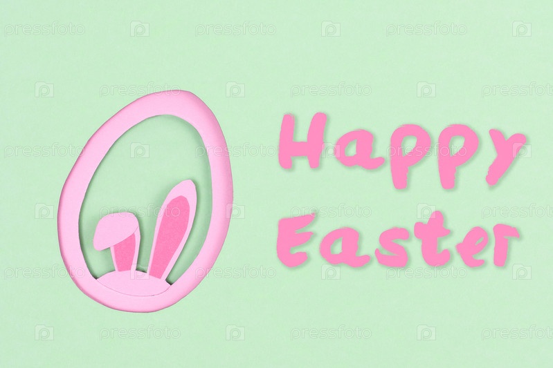 Вырезанные из бумаги розовые уши пасхального кролика и форма зеленого яйца с надписью Happy Easter. Пасхальная открытка с копией места для текста. Креативная пасхальная минимальная концепция, плоская планировка