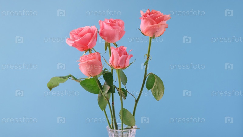 Букет розовых роз на синем фоне. Концепция дня рождения, матери, валентинки, женщины, свадьбы. Сезон весеннего цветения, розовые розы. Минимальная праздничная композиция. Копировать пространство