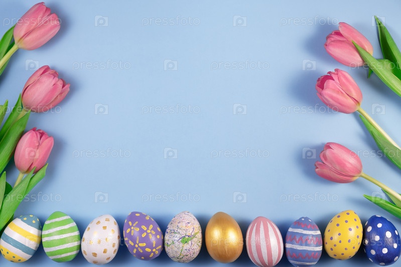 Розовые цветы тюльпанов и красочные яйца на розовом фоне. Карточка для счастливой Пасхи. В ожидании весны