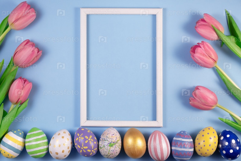 Цветы тюльпанов и пасхальные яйца с деревянной рамой на синем фоне. Карточка для счастливой Пасхи