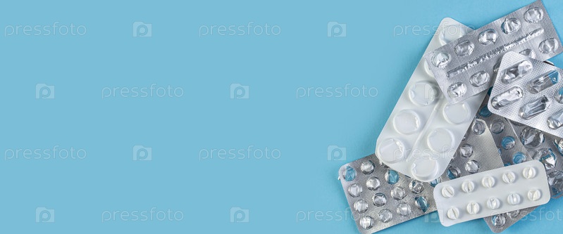 Куча использованных блистерных упаковок таблеток на синем фоне. Медицинские блистеры открыты и пусты без таблеток, вид сверху. Медицинский широкий баннер с местом для текста