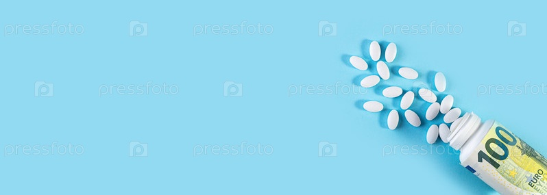 Длинный широкий баннер. Деньги и белые таблетки на синем фоне. Рост стоимости медицинской помощи. Фармацевтическое лекарство, лекарство в контейнере для здоровья. Концепция медицины с местом для текста