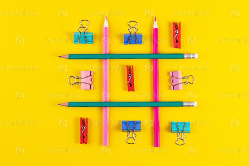 Школьные карандаши на желтом фоне со школьными принадлежностями