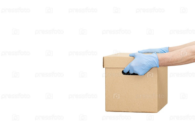 Доставщик держит картонные коробки в резиновых перчатках, изолированных над белым, копией пространства. Быстрая и бесплатная доставка транспортом. Интернет-магазины и экспресс-доставка