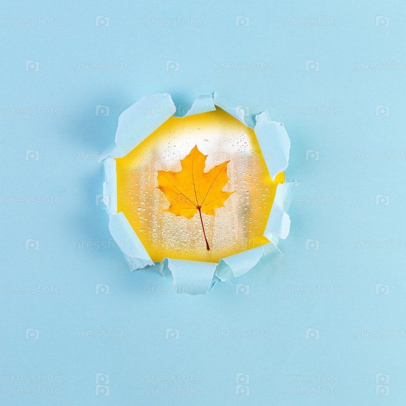 Осенний кленовый лист на фоне лопнувшей рваной бумаги